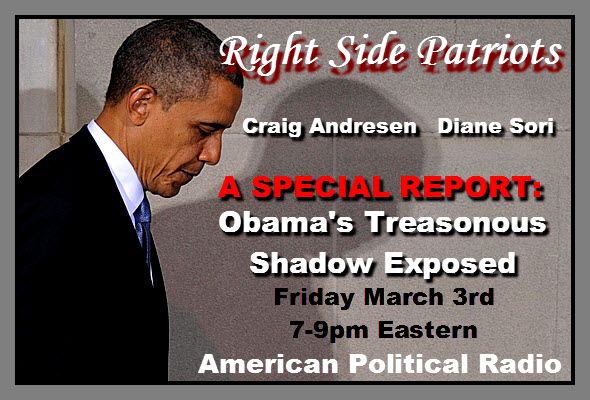 Today, Friday, March 3rd from 7 to 9pm on American Political Radio, RIGHT SIDE PATRIOTS Craig Andresen and Diane Sori present their special 'Obama's Treasonous Shadow Exposed' and it is not who or what you think. Hope you can tune in at:…Continue
